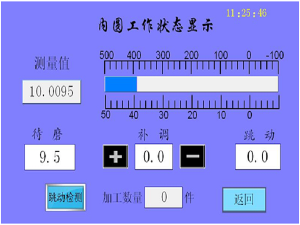 當(dāng)各種數(shù)值都設(shè)定好后,在“加工中操作面板”點擊“啟動”按鈕,便進(jìn)入自動測量狀態(tài)(儀器上電時自動進(jìn)入)。外徑與內(nèi)徑對應(yīng)不同的工作狀態(tài)顯示界面,分別如下圖所示: